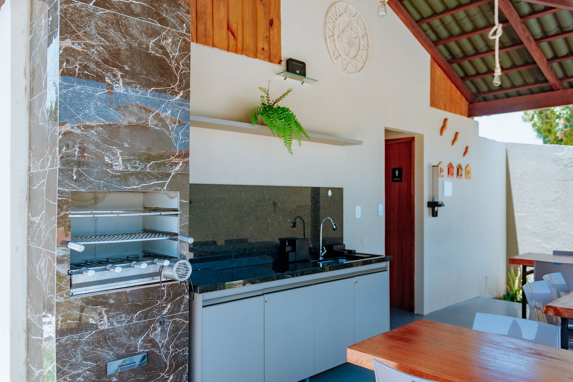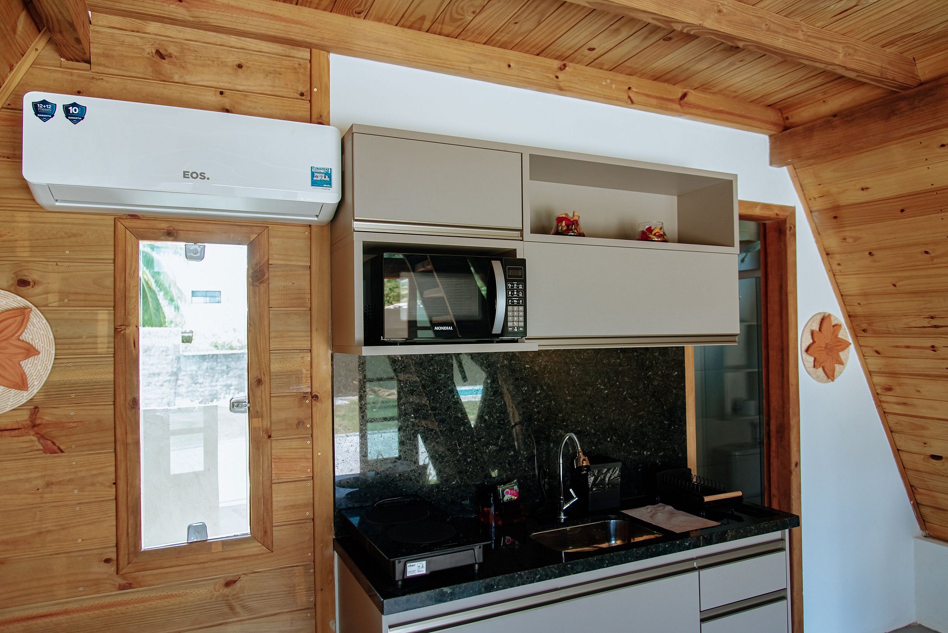 - Cozinha completa com frigobar, forno, micro-ondas, sanduicheira, kit café, chaleira, liquidificador, panelas, louças e utensílios.