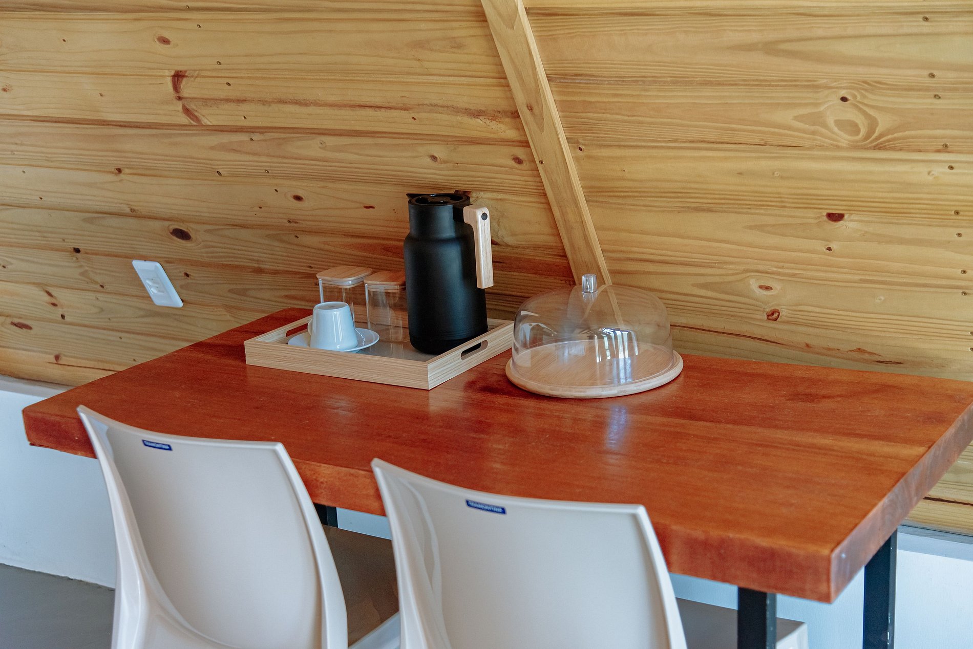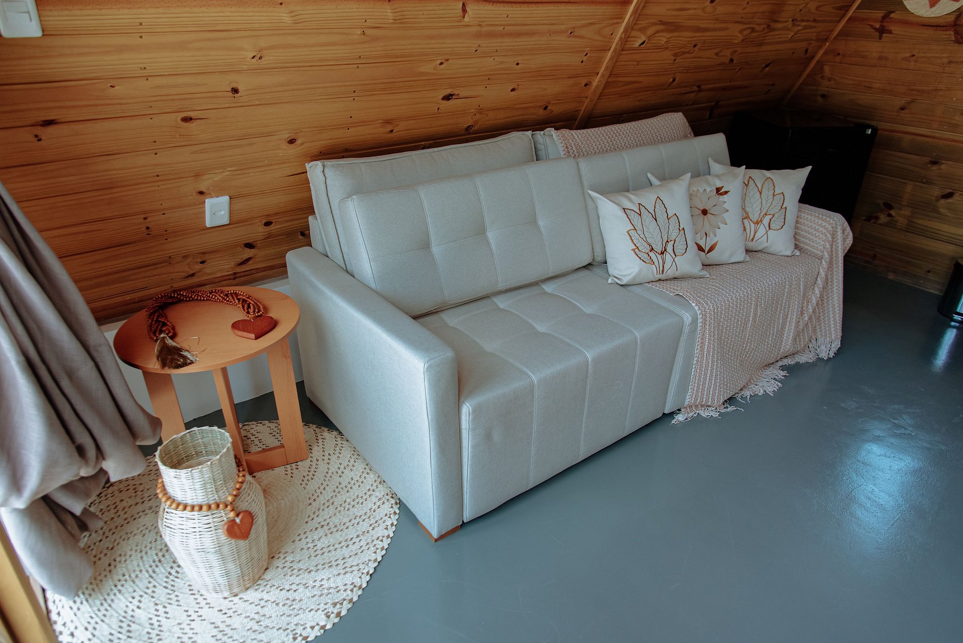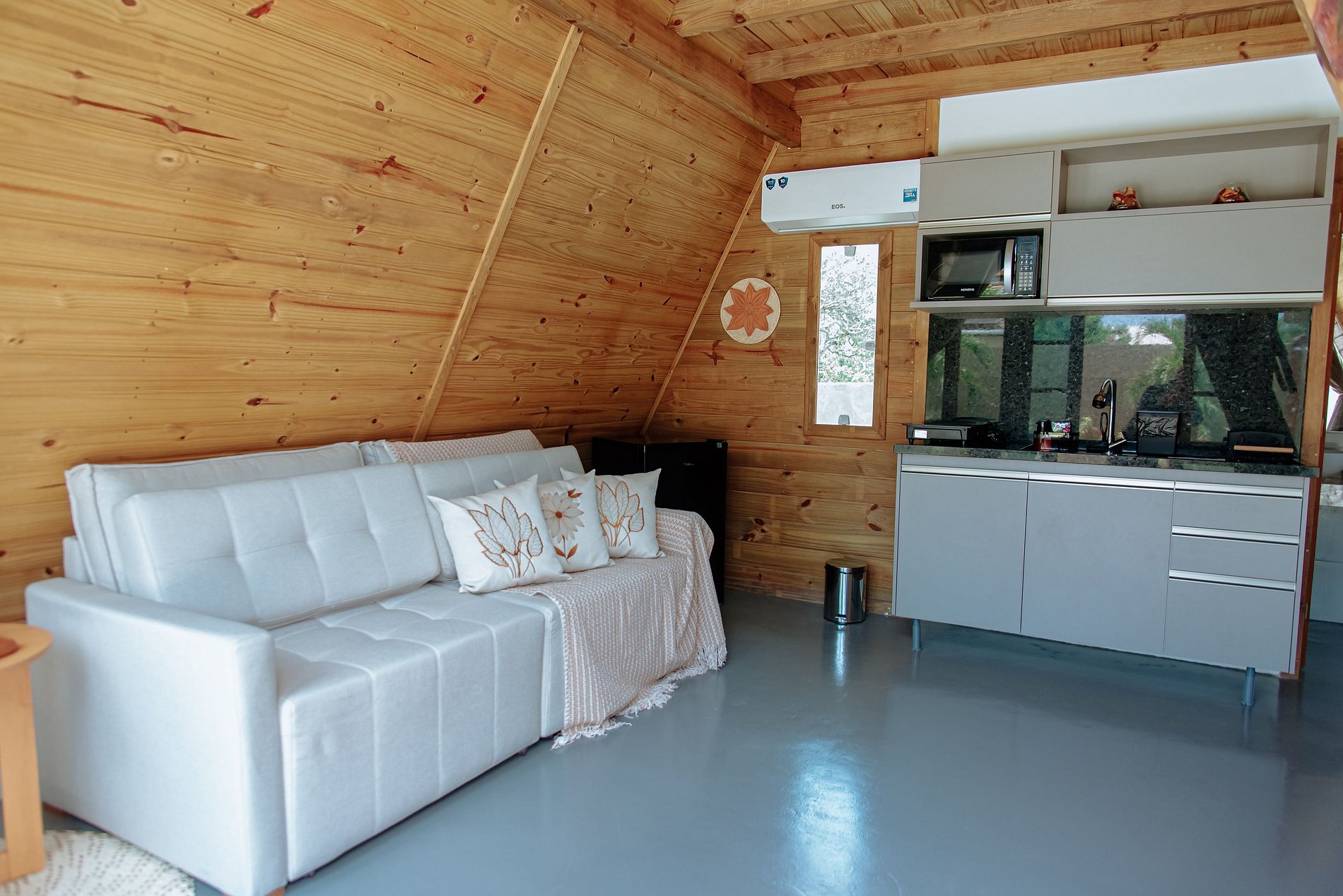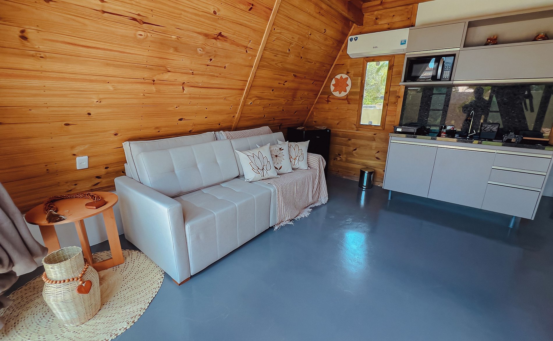 - Sala de estar com sofá, TV Smart, ar-condicionado e mesa com 2 cadeiras;