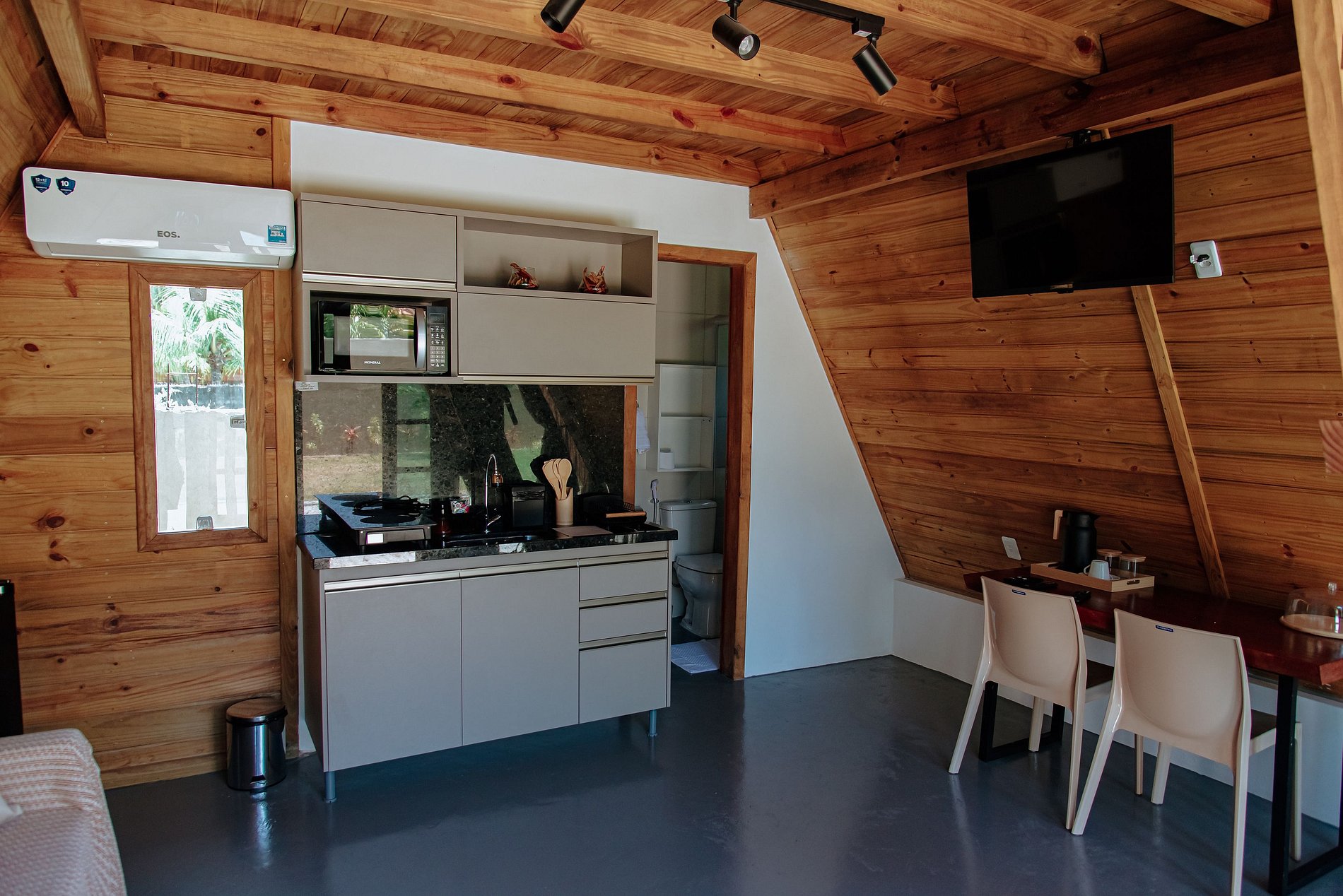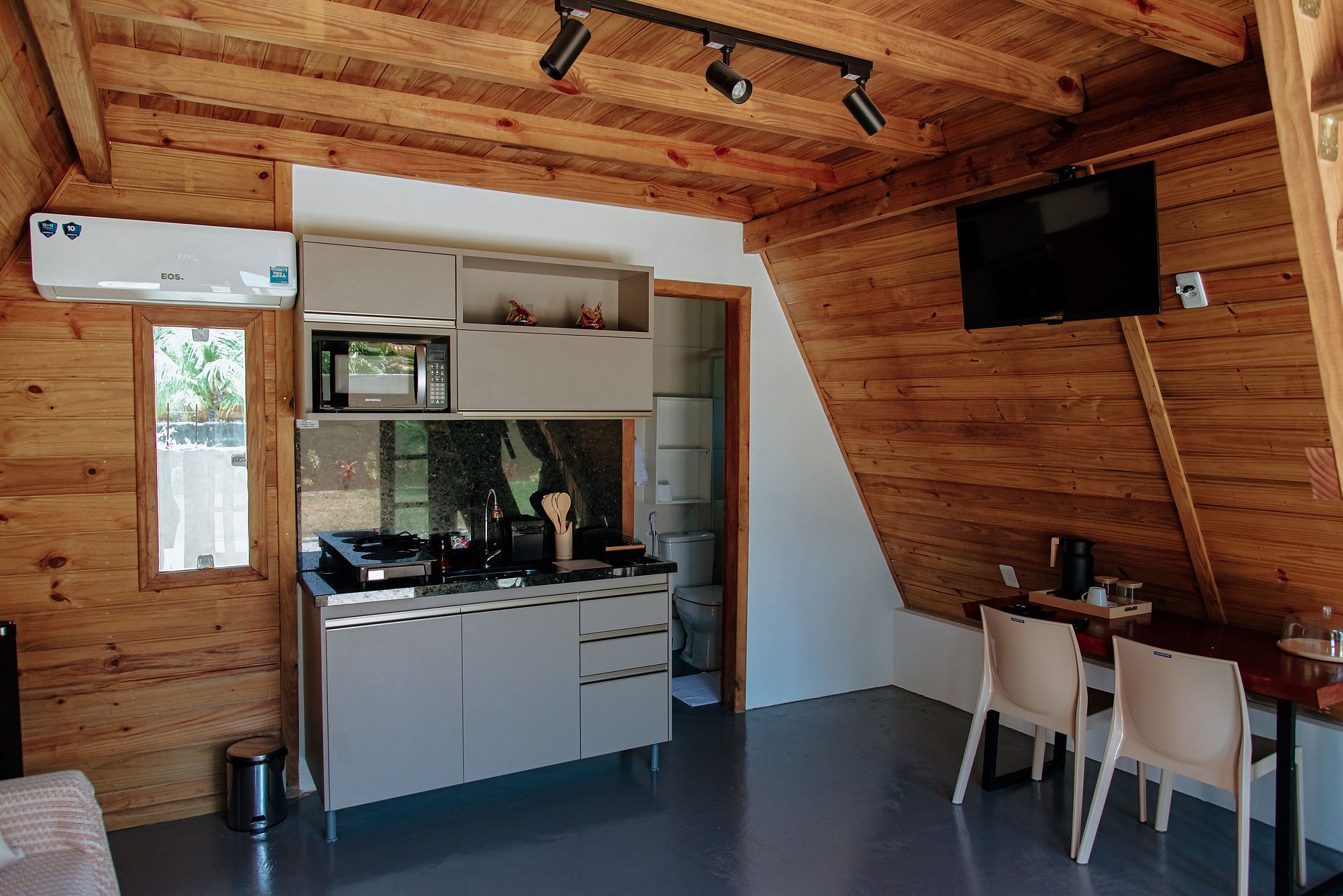 - Cozinha completa com frigobar, forno, micro-ondas, sanduicheira, kit café, chaleira, liquidificador, panelas, louças e utensílios.