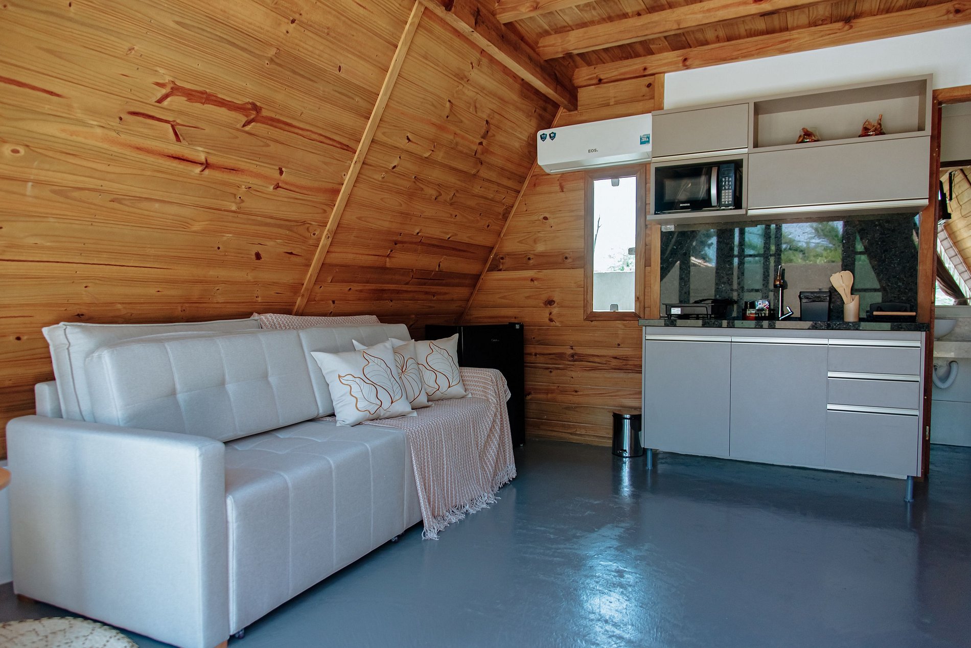 - Sala de estar com sofá, TV Smart, ar-condicionado e mesa com 2 cadeiras;