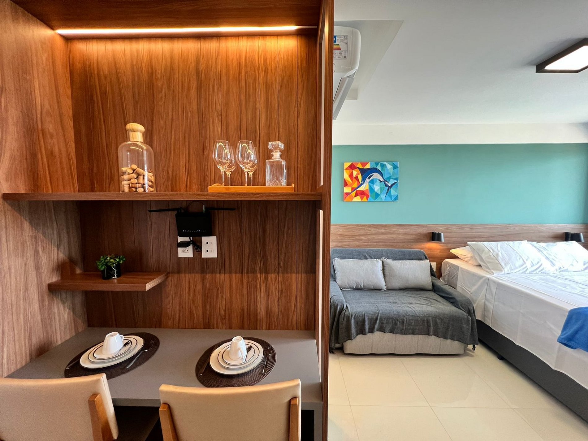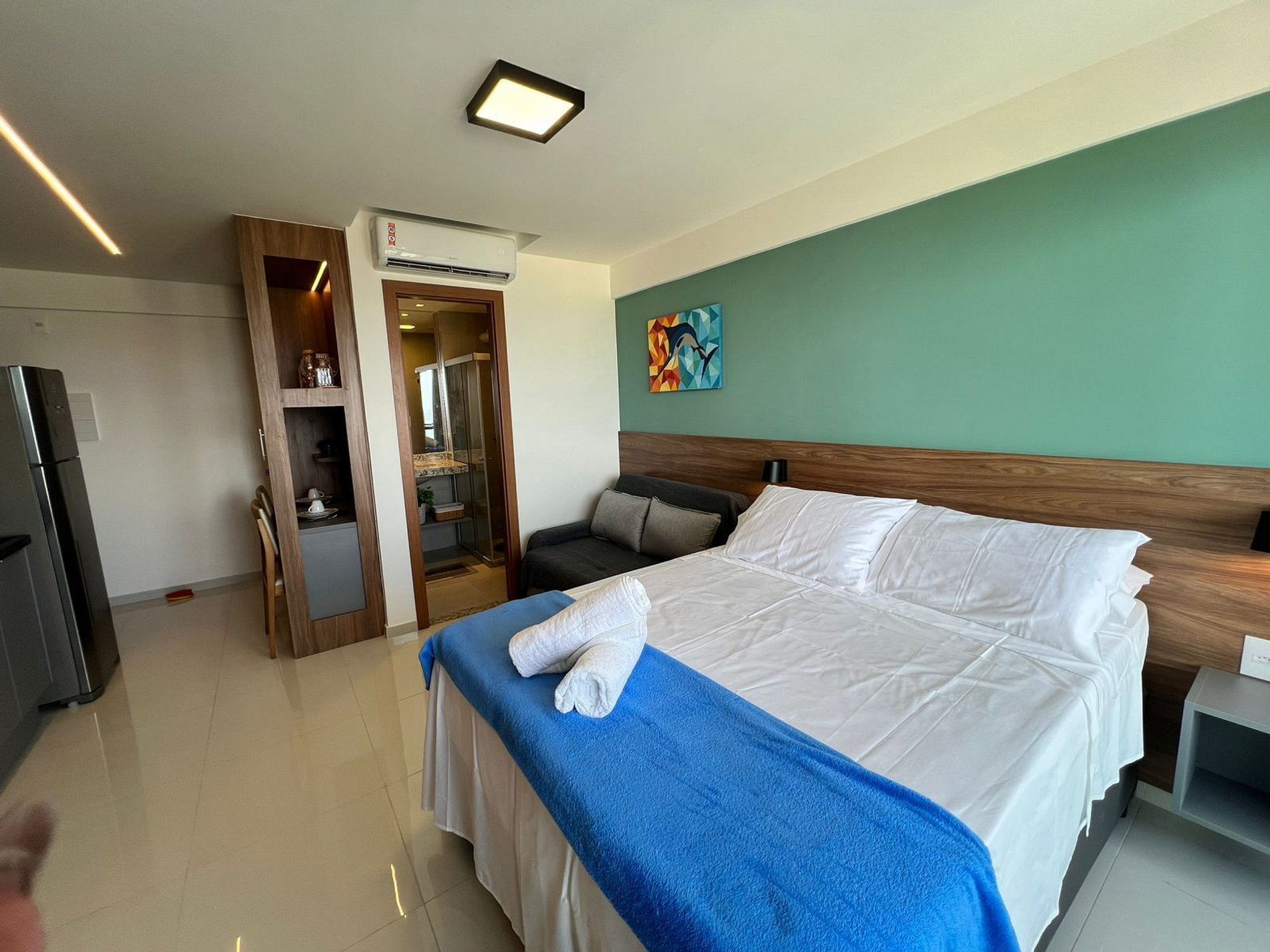 Suíte climatizada com smart TV, sala, cozinha equipada, garagem e condomínio com piscina e total estrutura. A praia está logo ali, perfeita pra começar ou terminar o dia com os pés na areia.